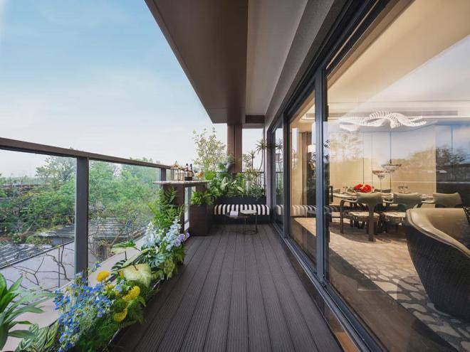 南向阳台,带来的是IMAX级瞰景视野,可以铺上古朴石板、挂上纱帘,搭一个榻榻米,放置一座茶台,点上线香,在古色古香的环境里,品一壶功夫茶。