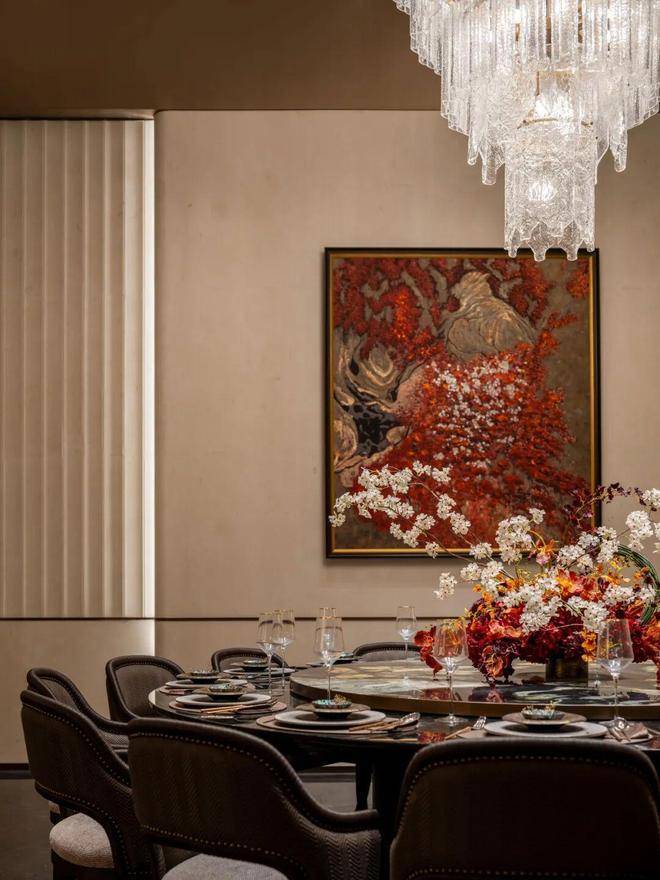 现场的软装与陈设,更是弥漫着艺术气息。应麦可抽象艺术挂画与非遗金属抬錾刻技艺装饰画,形成现代与传统的共鸣,为空间注入了艺术灵魂。