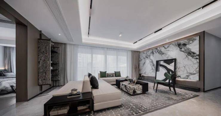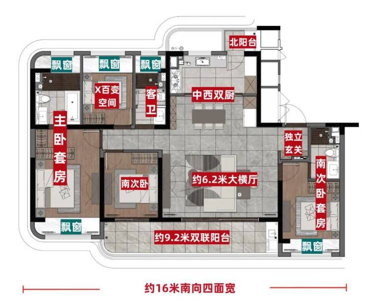 约16米的南向开间,实现了四开间朝南;南向约9.2米的双联跑道式阳台,有效连接客厅和南次卧,扩大了采光面和观景面。同时,家里的洄游动线也更加顺畅。