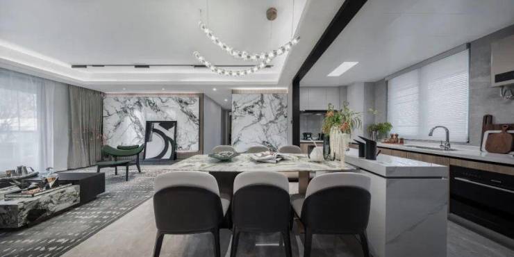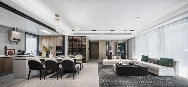 开合自如的中西双厨设计,不仅增加了全家人的就餐空间,还可以搭配岛台实现更多操作平台。且厨房还连接一个北向功能阳台,可以作为洗衣房或晾晒衣物,南北双阳台设计成全了功能+美观的两者兼得。