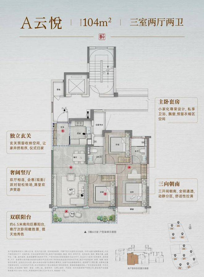 户型:104-140㎡三至四房,全系三开间朝南+大阳台设计,部分户型南北通透56。例如104㎡中间套为三房两厅两卫,主卧带飘窗;140㎡户型做到5开间朝南,南向面宽达16.35米。