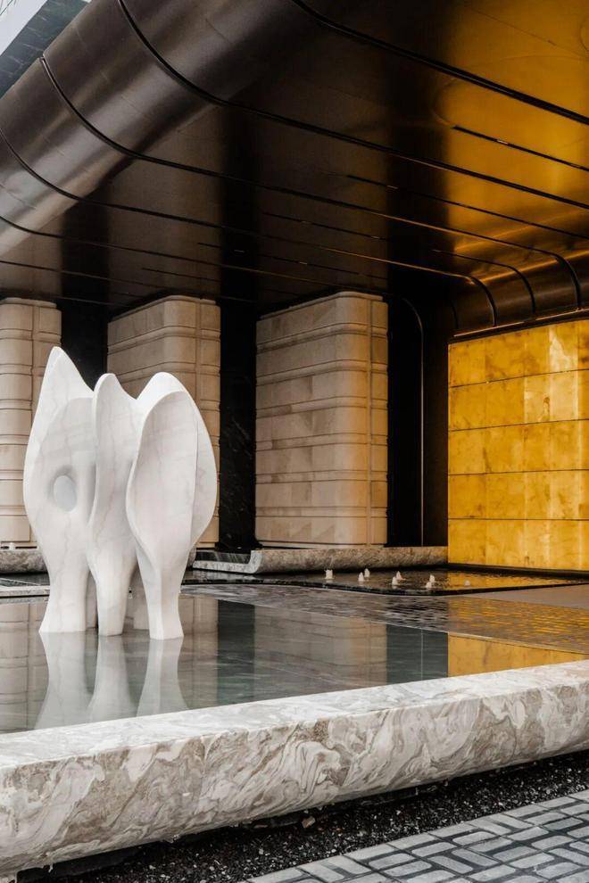其中,高约9米、宽约73米的主大门,从良渚玉琮与杭州油纸伞中汲取灵感,用奢石、水景、雕塑和金属精心铸造,谁看了都得行一会儿“注目礼”。