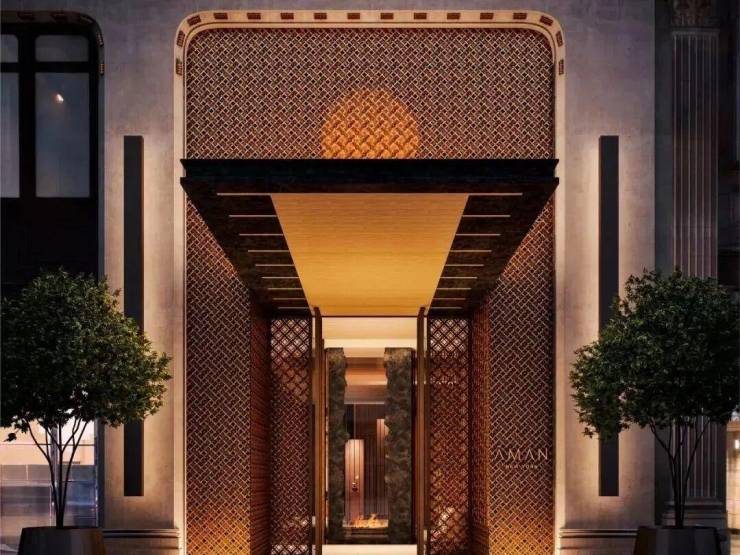 沐芳洲将大水院前置,做出了一个奢侈的超级前场。在长约150米的恢弘界面上,顽石、叠水、绿植、艺术雕塑高低错落分布,还有一面叠瀑从建筑立面里垂延出来。