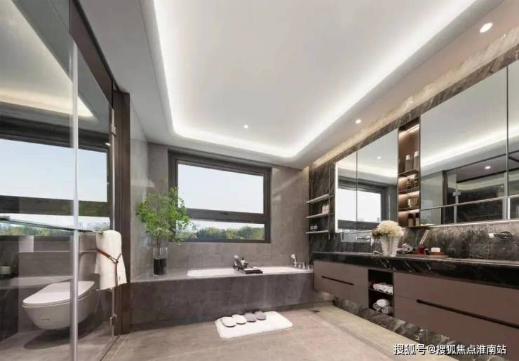 主卧豪华套房,面宽约5.4m,带衣帽厅和奢华卫浴体系。值得一提,还有一个南向次卧套房,卫生间也是朝南设计,避免暗卫。