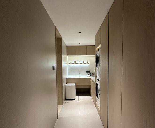 靠户型东侧,样板间设计了一个独立衣帽间和主卧套房的第二个卫浴空间。