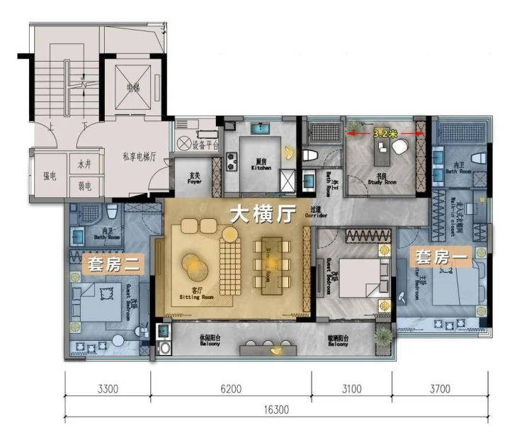 尤其这款建面约152㎡户型,他在这个面积段里囊括了一系列豪宅元素: