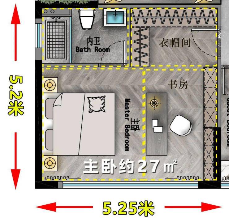 主卧5.25米X5.2米,尺度极其方正。