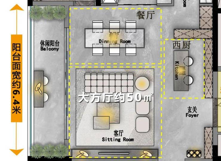 近50㎡的大边厅,除了常规的客厅、餐厅、玄关,竟然还多了一个高规格的西餐厅。