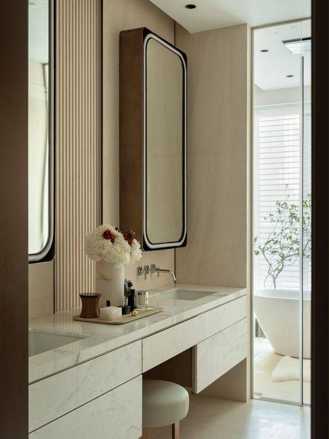 餐厅与客厅空间相贯连,开阔的视野带来惬意与更具互动感的用餐氛围。法国餐具品牌Christofle的精巧工艺与大理石水墨画般的自然纹理交相叠映,镜面光泽,熠熠生辉,每一处细节都彰显着对品质生活的极致追求。
