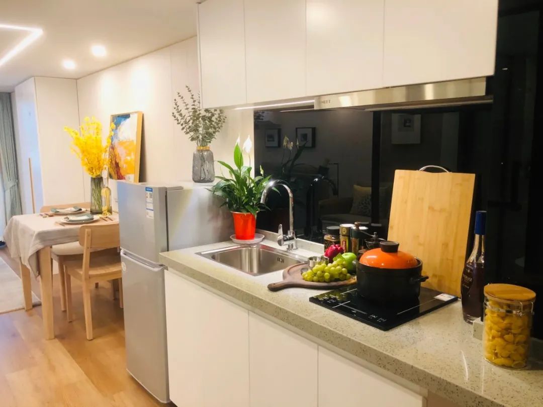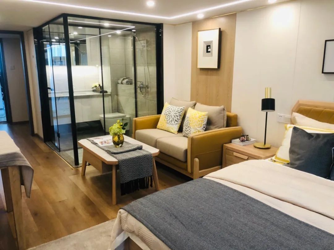 呈半围合状的2、3、4、5号楼对外销售,这4幢楼总层高11层,底层是4.9米层高的商铺,2-11层是4.2米层高的酒店式公寓。我们现在所看到的整体外立面是浅色系的,设计师秉着人与自然和谐的理念,采用层层退台的形式设置了空中花园【分别位于2、5号楼南向9-11层、3、4号楼东西向10-11层】,将建筑与绿化有机融合,打造绿化生态系统,结合地面半围合状的小广场景观,为业主营造了休闲、娱乐的生活场所。