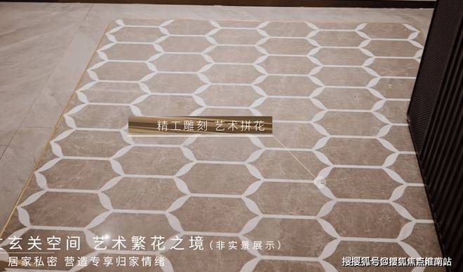 当然,超出我们预期的是,在约126㎡的户型中,装标再次升级:入户玄关采用海派风格中常见的整块艺术拼花设计+金属包边,仪式感更加突出: