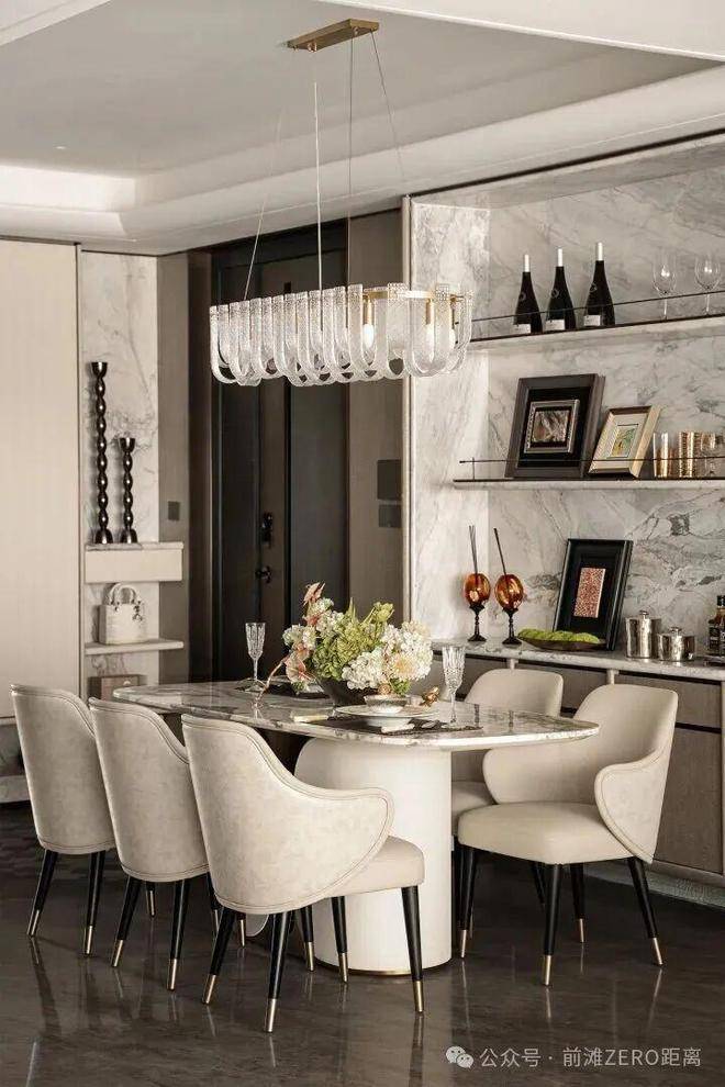 大量运用手工缝线皮革与大面积奢石的对碰、艺术肌理墙纸与天然雀眼木饰面橡木地板的交融,品质感拉满。