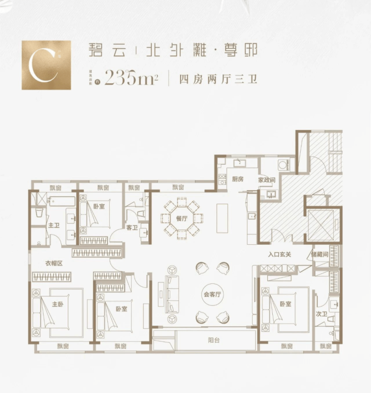 建面约235㎡4房2厅3卫:约7米超大横厅,三卧室朝南,LDKB一体格局,约60平社交会客厅,全屋飘窗通透采光、大尺度景观阳台,超30平至尊套房主卧、双南套房、全明三卫设计、高规格精装标准。