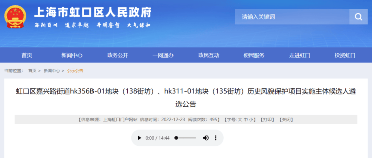 2022年12月23日 虹口区人民政府网发布了关于嘉兴路街道hk356B-01地块(138街坊)、hk311-01地块(135街坊)历史风貌保护项目实施主体候选人遴选公告。