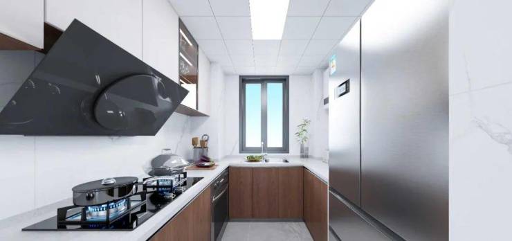厨房为U型布局,配置 定制橱柜、老板烟灶、林内热水器 ,台面为人造石,水槽为邦克台下盆,细节处体现人性化考量。