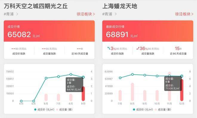 据兔博士数据显示,上海蟠龙天地最新成交均价约6.88万/㎡;万科天空之城最新成交均价约6.5万/㎡。