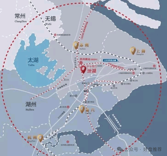 苏州南站(汾湖站)位于长三角一体化先启区——汾湖,沪苏湖铁路、通苏嘉甬城际高铁于此呈“十字”交汇,其中沪苏湖铁路由上海虹桥枢纽引出,途经上海松江、苏州吴江,至浙江湖州站,通车后将实现由汾湖8分钟到松江,20分钟到达上海虹桥枢纽,将汾湖与上海更紧密的联系在一起。