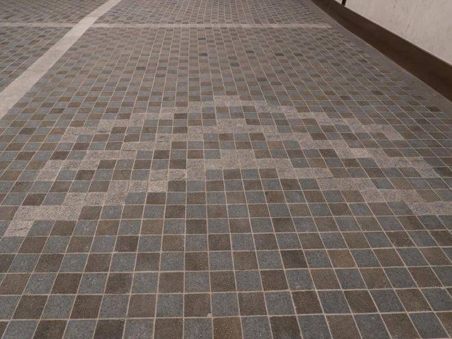指引箭头与分割线,皆以同厚度的马蹄石精准镶嵌。于沉稳的暗色中勾勒出清晰利落的视觉节奏与秩序。