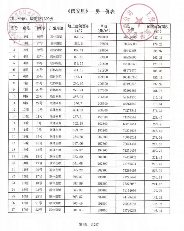 一房一价表如下