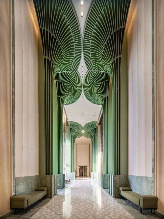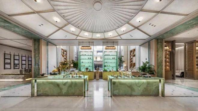 以杭州折扇为灵感而造的超尺度门庭,12片巴西进口百达翡绿玉石屏风,由非遗传承人朱炳仁团队打造的巨幅铜门,“玉镜流光”雕塑,大堂内八根巨幅立柱,还原了扇骨的形态,汝窑冰裂纹的陶片镶嵌,地面拼花运用江南花窗元素……