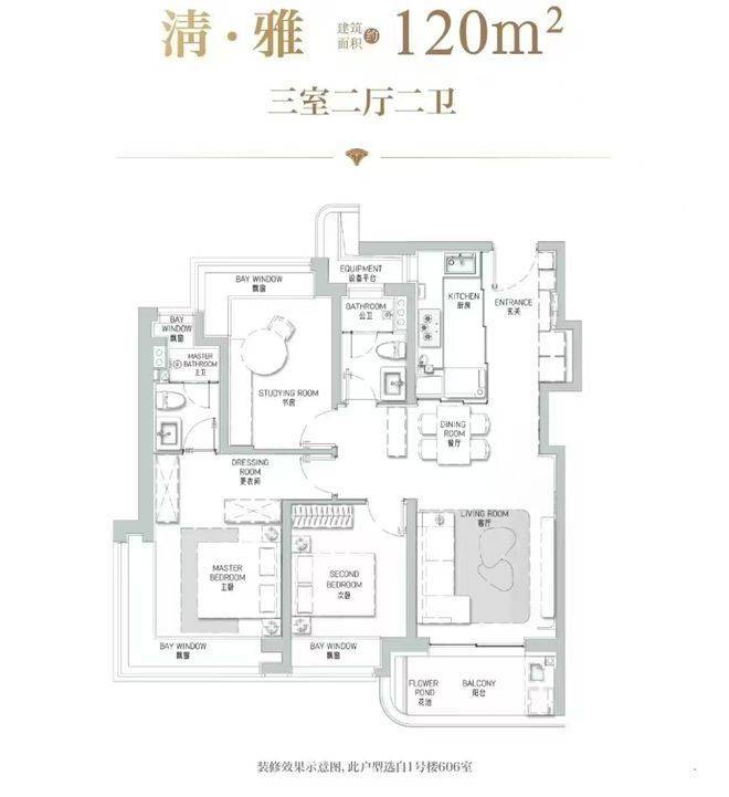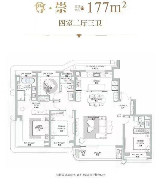 主力户型建面约112-177㎡,从三房到四房的阔绰空间,每一户都经过精心设计,兼顾了现代家庭的居住需求与对景观视野的最大化利用。特别是建面约177㎡的四房户型,总价约2300-2500万级,四开间朝南设计+双套房配置,保证了家庭成员起居的私密性。客餐厅尺度阔绰,方正大气,自带曲面流体阳台,主卧带转角飘窗与双台盆设计,尽显尊崇。标准层层高约3.15米,比常规户型多出约15cm,纵向尺度的延伸为室内释放出更多收纳空间。