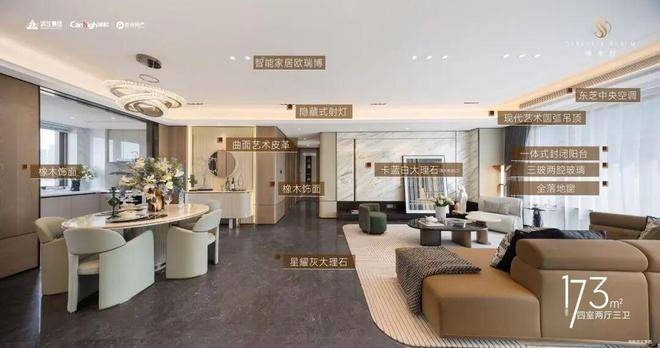 你看,餐客厅墙面选用天然尼斯木饰面。全屋共运用5种不同石材,如奥特曼米黄、塞浦路斯灰、意大利进口鱼肚金等。主卫台面为皇家白玉,公卫则选用白月光。