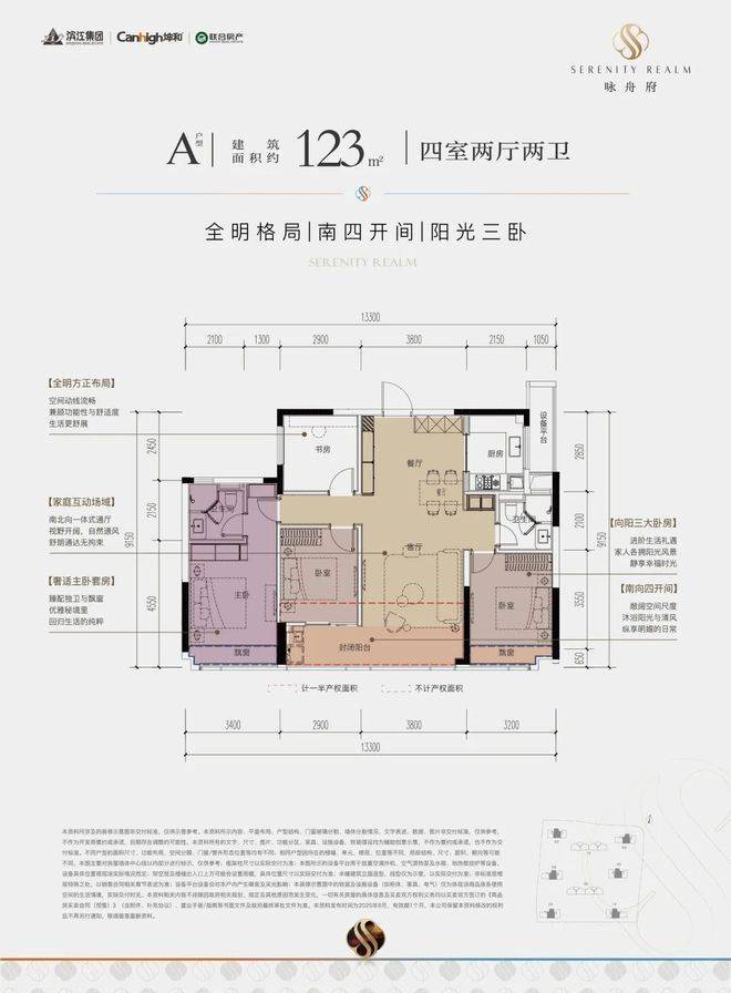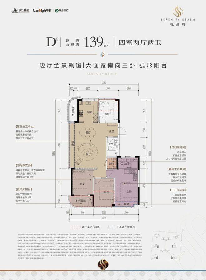 一款是四开间朝南的横厅户型,南向约13.85米的极致采光面,阳台也有约9.8米;动静分区,私密感超强;主卧套房带L型弧形转角飘窗,居住体感堪比全景舱。