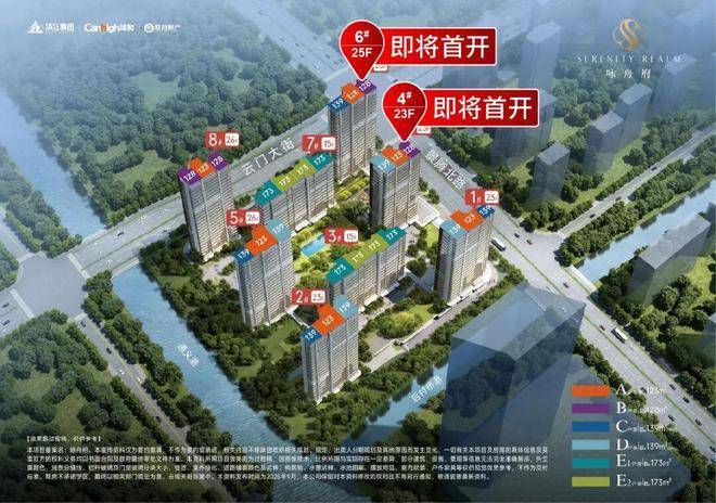 :8幢15-26层高层住宅,容积率2.4,总户数532户,主力户型123-173㎡,层高3-3.15米(部分户型3.15米)。