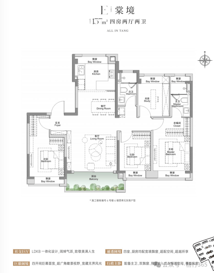 建面约105㎡3房2厅2卫,做到了三开间朝南+4个飘窗+双面阳台系统+主卧套房设计+270°转角飘窗,该户型的居住体验、舒适度、尺度感,是同级别产品所无法比拟的。
