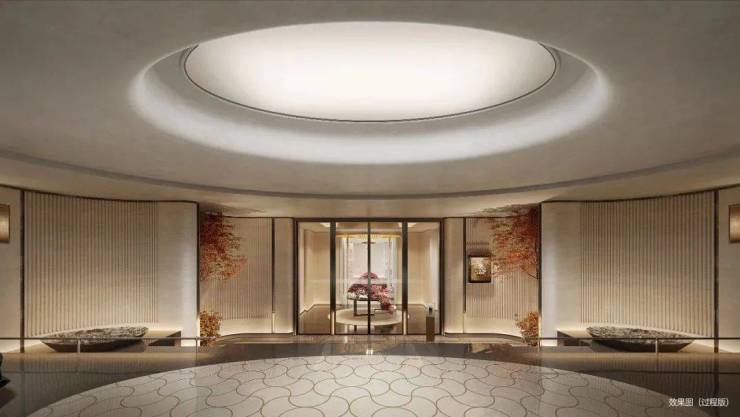 社区大堂极具仪式感,未来会采用地下会所设计,入口采用三重弧形石材墙体+圆角幻彩穿孔顶,夜幕下如流淌的鎏金河流。