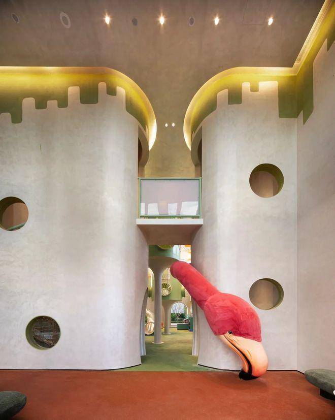 比如:考虑到之江这边的客群,家里大多都有即将或者正在上学的孩子,所以知海棠直接舍弃了一套可售房源来做超大童玩空间。整体面积超过480平米,还考虑不同年龄阶段孩童的需求来做规划,有大一点孩子更适合的树屋、滑滑梯;有更小一点孩子更需要的“四点半学堂”等等......甚至就连这块区域的“绿色”的主色系,地面的塑胶板材都是团队提前反复考量的。