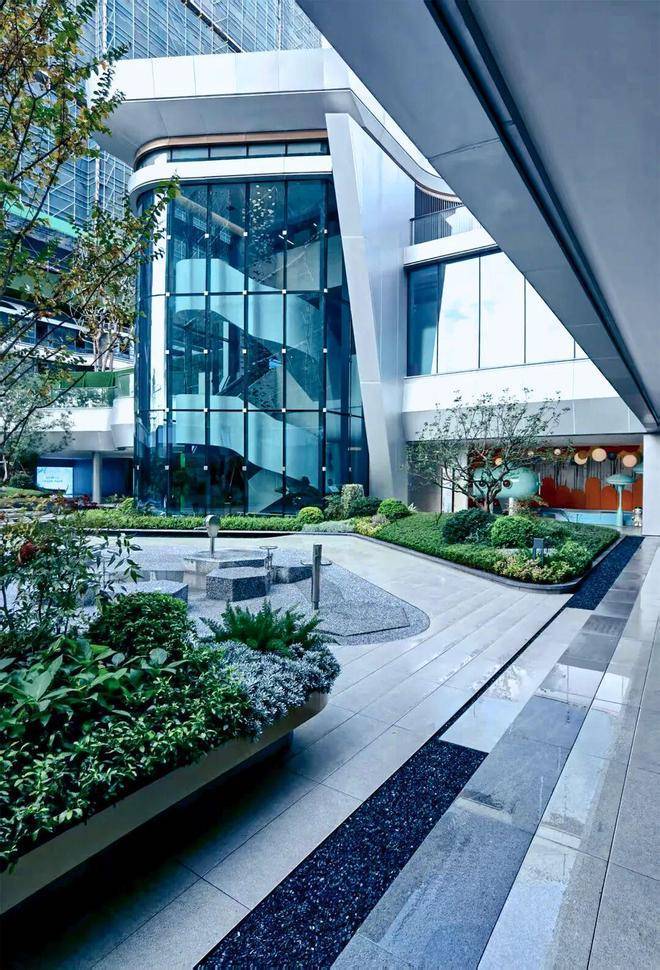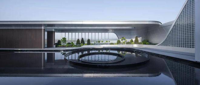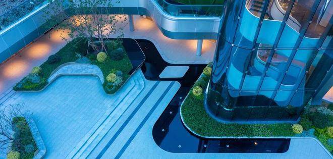 建筑体量延伸至室外下沉庭院,后场在前场及建筑造型的基础上加以演变,运用折弧线等流线性,营造出丰富且动态的后场景观。