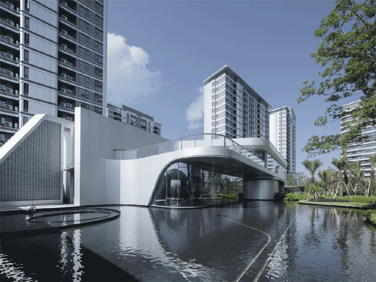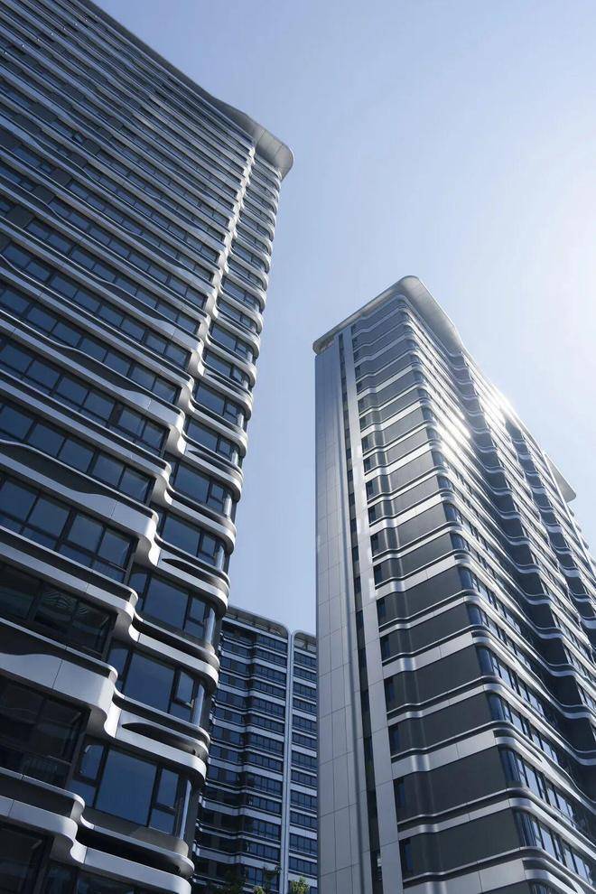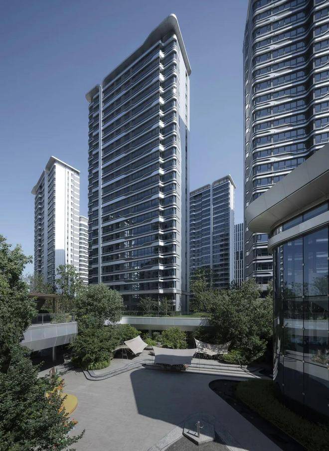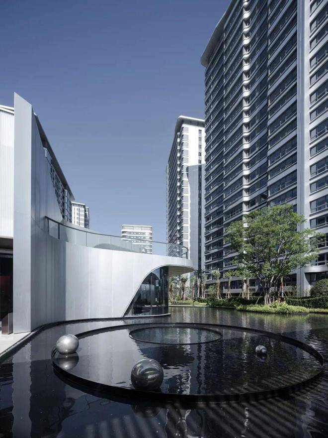 银白色铝板立面在灵动总图规划的映衬下熠熠生辉,流畅的线条与光影交织,营造出极具未来感的建筑美学。步入小区内部,纯净的金属质感与空间韵律相得益彰,仿佛置身科幻场景,每一处转角都暗藏惊喜。
