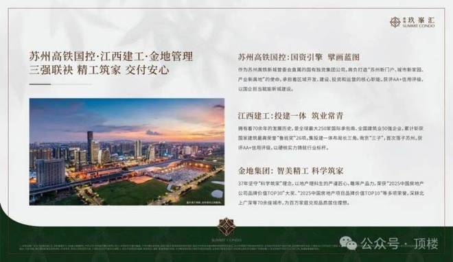 近1000㎡的下沉立体庭院四面环景,提供极致奢华的生活体验。苏州高铁国控、江西建工和金地集团三强联手,以精工品质筑家,让交付时更加安心。
