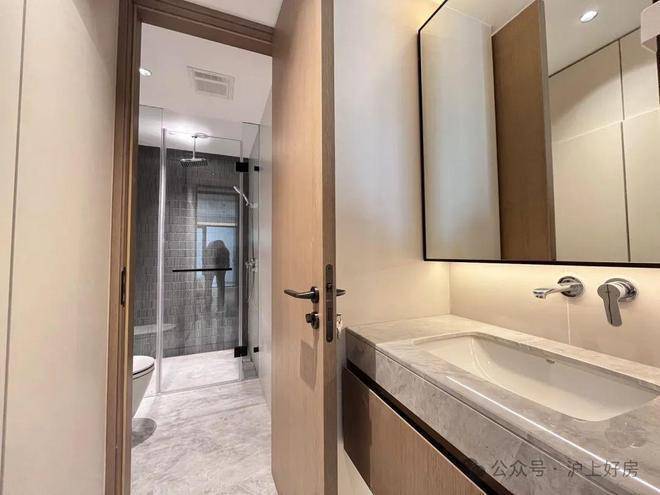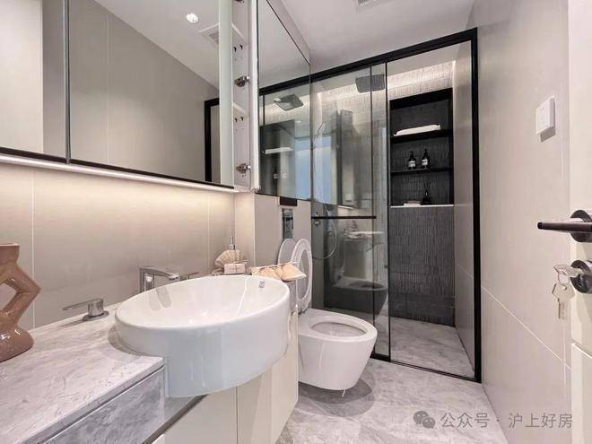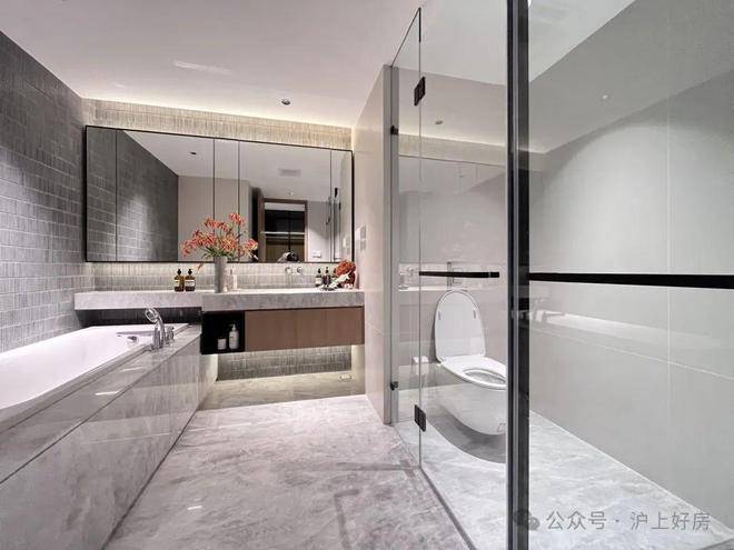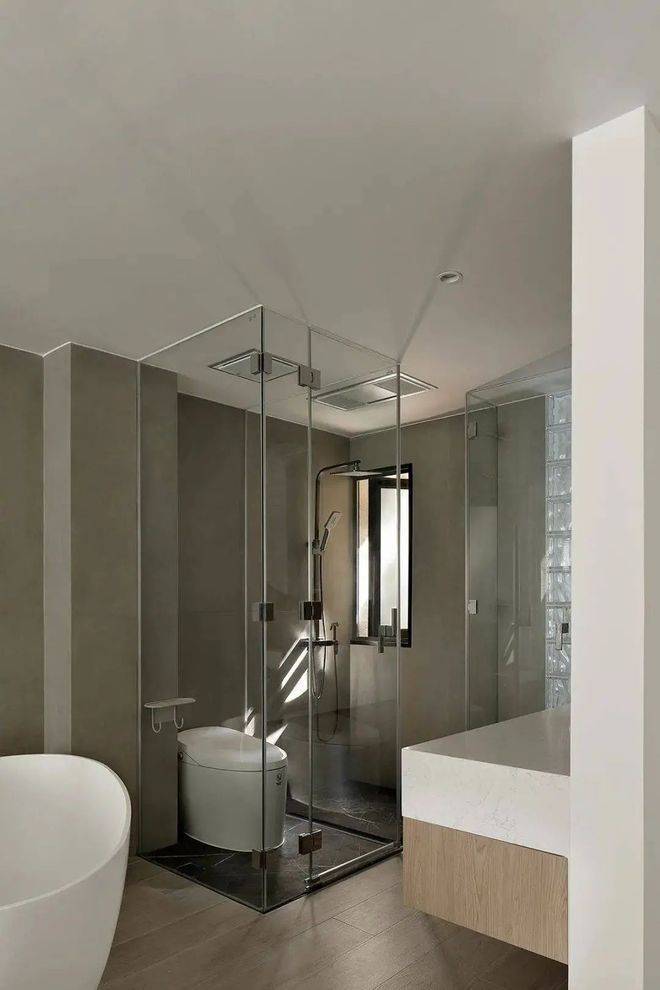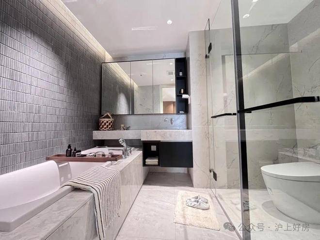 主卫用玻璃隔断,浴缸、洗漱区、淋浴区,功能齐全。