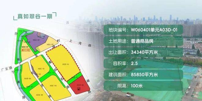 A03D-01地块:出让土地面积34340平方米,土地用途为普通商品房,规划容积率2.5,计容建筑面积85850平方米。