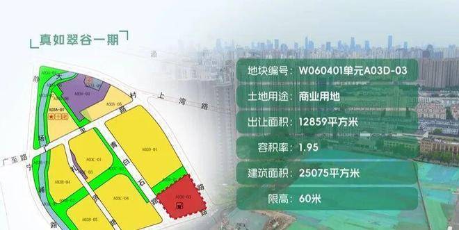 A03D-03地块:出让土地面积12859平方米,土地用途为商业,规划容积率1.95,计容建筑面积25075平方米。