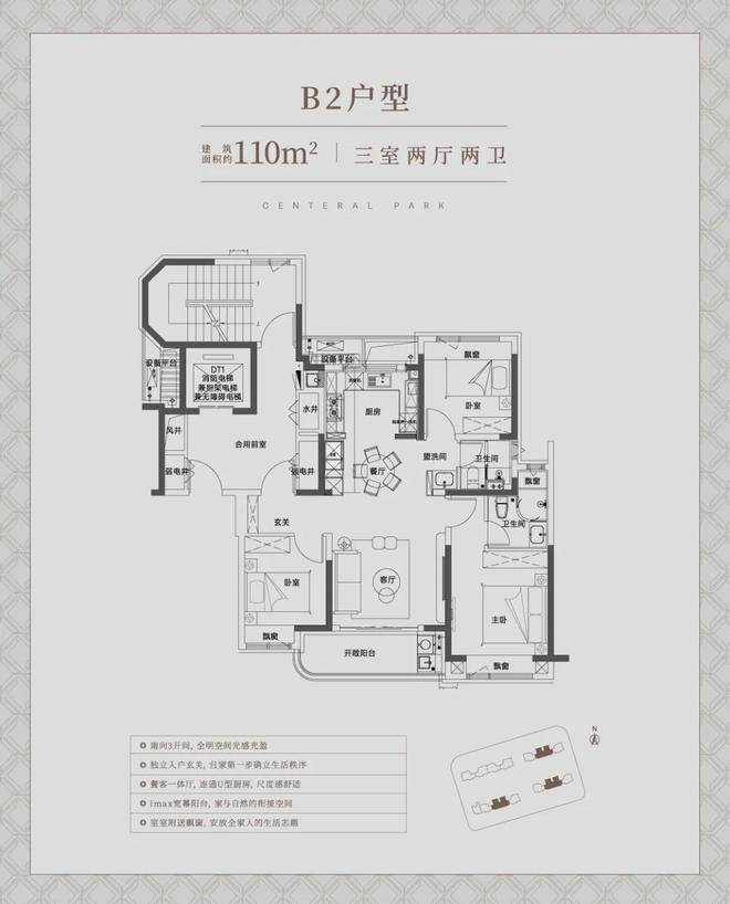 再来看建面约110㎡中间套竖厅户型,非常标准的南北通透飞机户型,0空间浪费,餐客厨一体化设计增强家庭互动。
