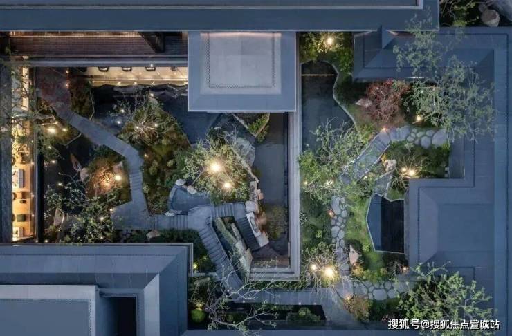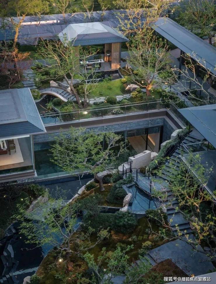 通过下沉会所庭院,将传统平面绿化转化为垂直的多层次园林空间,打造出了当代立体山体水景观,身处其中在步履起承转合间,串联起一幕幕诗画风景。