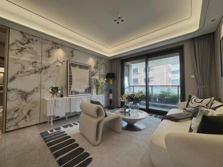 其次,是客厅交付了皮质软包+木饰面硬包。在建面约104㎡2房的交标样板间里,我们发现整个客厅的墙面,全部升级了木饰面+皮革的编制,材质的升级,带来的客厅质感的直线上升。