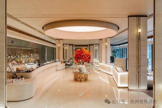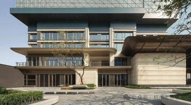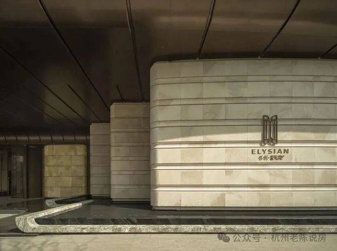 两侧立面采用横向肌理,材料选用贝金米黄石,形成流动的视觉节奏,象征时间的延续与城市的脉动。细部的月牙弧线处理,呼应西湖水波的柔美韵律。