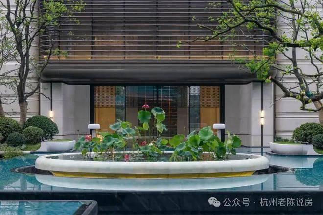 庭院景观以西湖荷花为核心设计元素之一,水桥的形态则借鉴并转译西溪湿地的自然肌理,使整体空间在文化意象与自然特征之间建立关联。