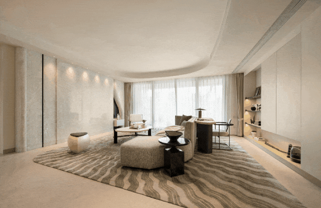 杭序府的外立面采用弧线转角阳台+蓝灰色钢化LOW-E玻璃,公建化立面拥有超高窗墙比。同时,大量曲线元素的运用,不仅造价昂贵,而且极具辨识度,成为区域的颜值担当。