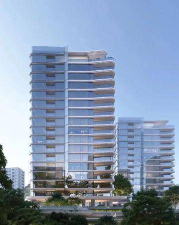 建筑创新:整体抬高3米打造“空中花园”,采用蓝灰色玻璃幕墙与弧形阳台设计,采光优越,地下设环岛通道,首层5米挑高会所。