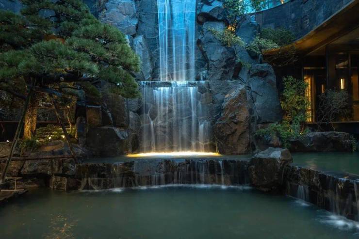 利用高差优势,安云玖院匠心营造一座7米高浓缩山林、溪涧、叠瀑于一体的“立体山峡”中庭景观。整个景观庭院全奢石铺就,没有一块砖!飞瀑旁一棵斜飘式进口黑松“旭日龙鳞”,树龄300年价值200万,更有进口龙梅、羽毛枫、杜鹃球等一同构成 “门庭名树群落”,为业主营造极为尊崇的归家威仪!
