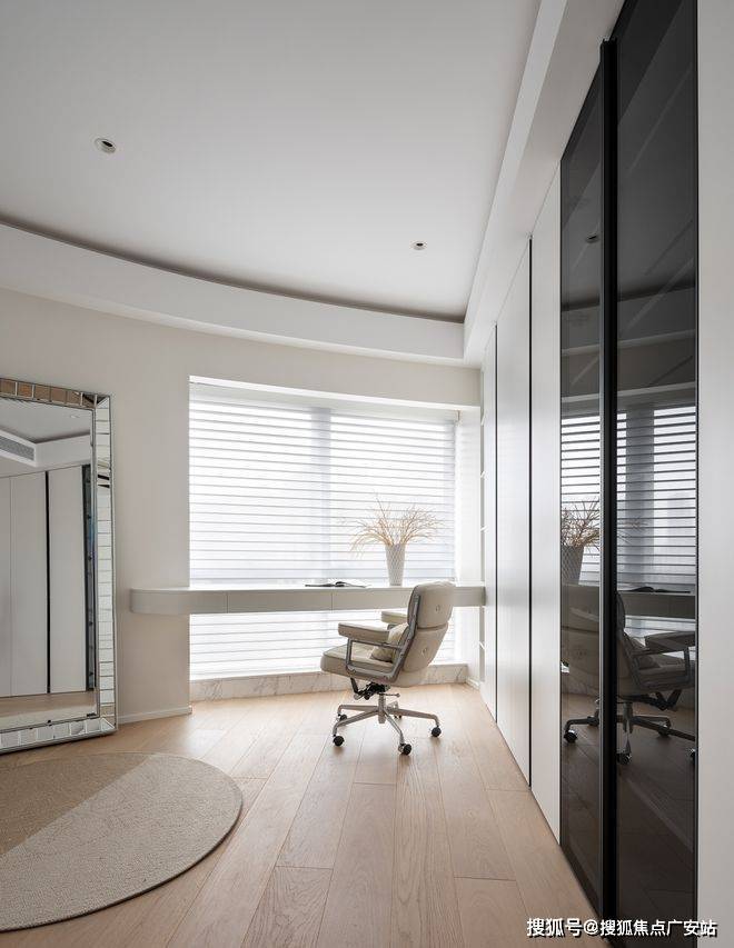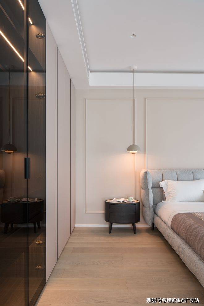 主卧,整洁宁静的配色,呈现至简至美的气质,细腻简约的饰面,床头背景墙的法式线条元素,原木质感的材质,柔和的灯光设计让空间富有节奏感。