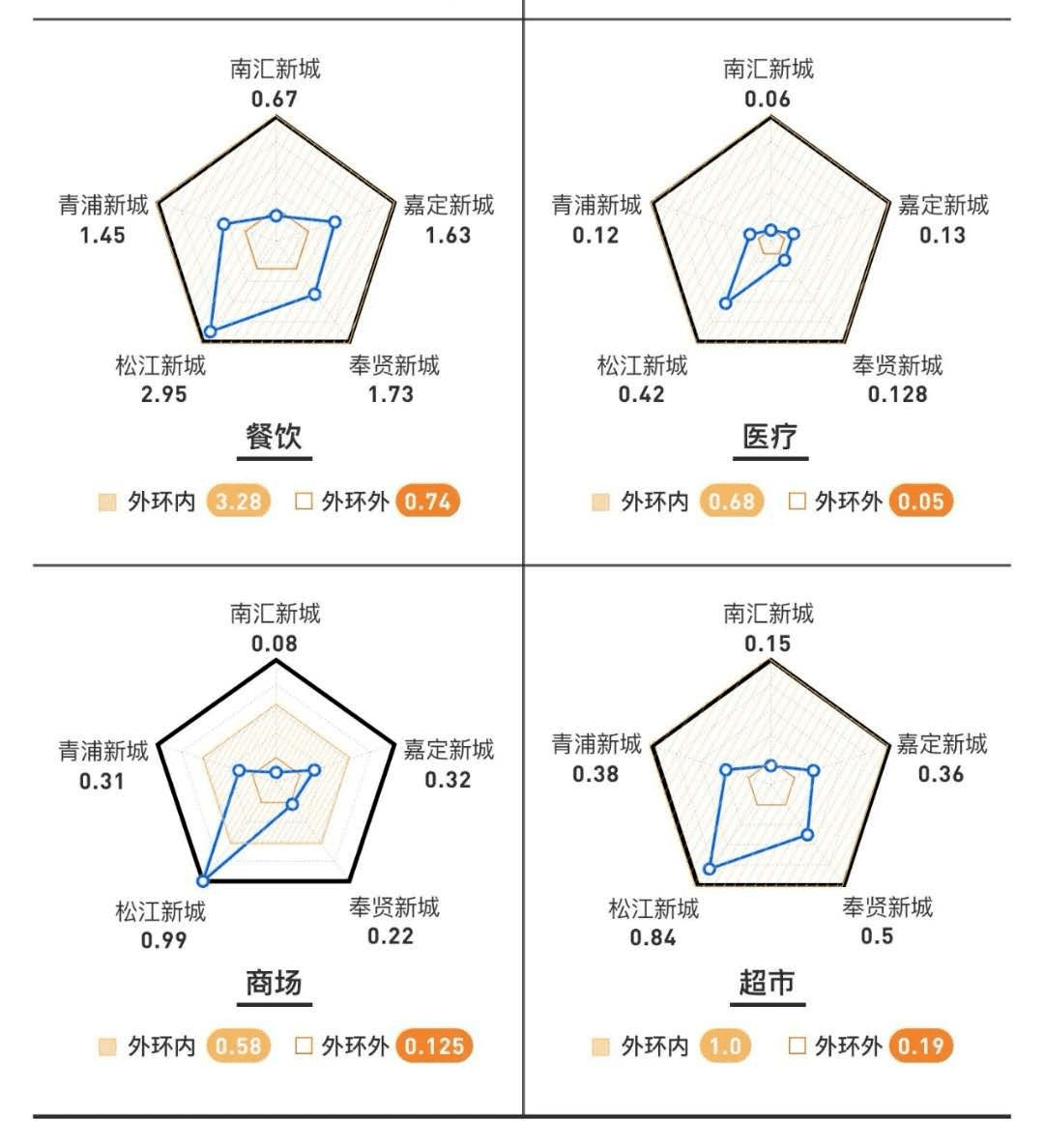 松江是上海之根,松江新城是上海较早开发的新城,也是较早通地铁的新城,商业医疗等城市配套密集程度在新城中首屈一指,下面这个对比一目了然。
