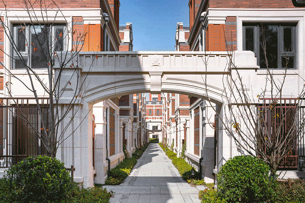 小区整体采用了南低北高阶梯式的建筑格局,并结合“厅、堂、园、宅”的空间景观布局及“街、巷、弄”的上海特色街道布局还原最纯正的老上海石库门里弄建筑风格。