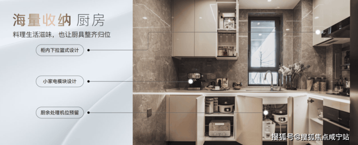橱柜收纳系统:特别预置洗碗机点位、柜内下拉篮式设计、不锈钢挡油板、柜下操作灯、烹饪全流程功能动线一体化设计;