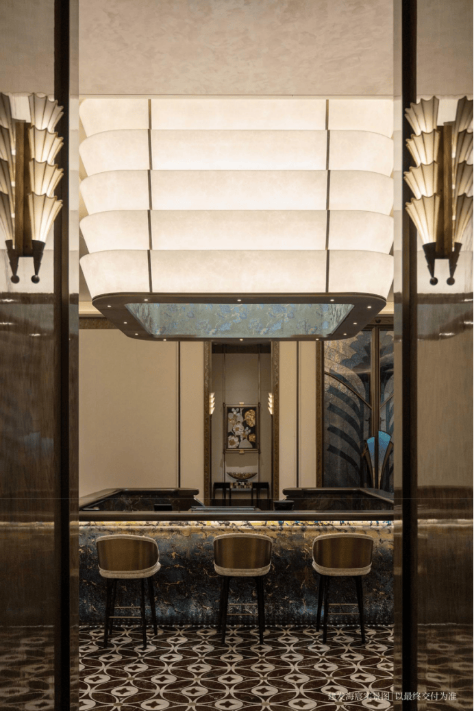 飞翼祥纹铜雕大门巍然矗立,非遗掐丝珐琅门钹镶嵌其上,值得一提的是,门钹由上海老凤祥珐琅首席技师、非遗海派珐琅金银器传承人陈徐奇亲手铸制,每一次触碰宛如触摸东方文明的密码。